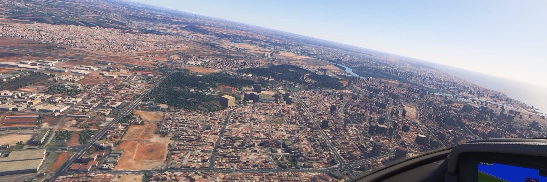 Der virtuelle Flug beginnt am kleinen Flugplatz von Buarfa, wo die Hitze des frühen Nachmittags bereits über der staubigen Landschaft flimmert. Der Cirrus Jet beschleunigt über die kurze Piste, hebt sanft ab und steigt zügig in den klaren, wolkenlosen Himmel auf. Unter dir breitet sich die karge Weite des Ostmarokkos aus – ockerfarbene Ebenen, durchzogen von trockenen Flussbetten und vereinzelten Siedlungen. Mit zunehmender Höhe wird die Luft ruhiger, und der Jet gleitet mit beeindruckender Leichtigkeit dahin. Die Sonne steht hoch, taucht die Landschaft in ein grelles, fast goldenes Licht, während die Schatten der Hügel scharf gezeichnet sind. In der Ferne erscheinen erste grüne Flecken – ein Zeichen, dass sich die Region um Oujda nähert. Beim Sinkflug verändert sich das Bild: Felder, Straßen und Gebäude werden klarer erkennbar, das Leben am Boden wirkt plötzlich nah. Der Cirrus Jet setzt schließlich ruhig auf der Piste von Oujda auf, und der Flug endet genauso elegant, wie er begonnen hat – ein kurzer, aber eindrucksvoller Trip über die kontrastreiche Landschaft Marokkos.