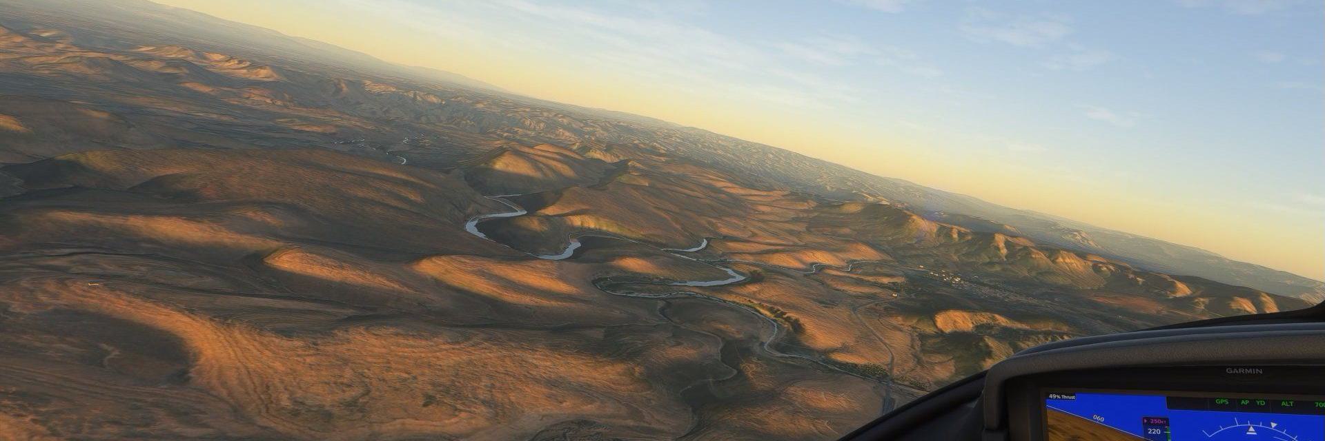 Der virtuelle Flug beginnt am kleinen Flughafen von Ouarzazate in Ouarzazate, am Rand der weiten Wüstenlandschaft. Der Cirrus Vision Jet hebt sanft ab und steigt über die rötlichen Ebenen, während die Sonne das Atlasgebirge in warmes Licht taucht.
